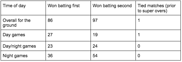 The time of day the match takes place (day/night games often favour the team batting second due to the presence of dew on the field as night falls)